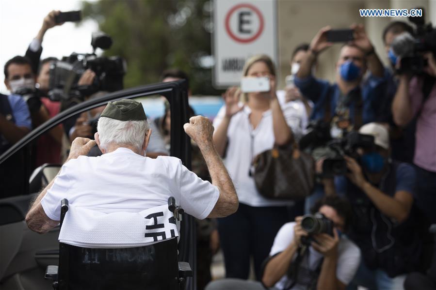 Ernando Piveta (front), a 99-year-old Brazilian World War II veteran, is discharged from the Armed Forces Hospital after recovering from the COVID-19 in Brasilia, Brazil, April 14, 2020. Ernando Piveta, who had been a member of the Brazilian Expeditionary Force, was admitted to the hospital on April 6 and treated in the facility's "COVID ward" after testing positive for the virus, the Defense Ministry said. Born on Oct. 7, 1920, Piveta received the Medal of Victory from Brazil's President Jair Bolsonaro last year for his service to the nation. (Photo by Lucio Tavora/Xinhua)