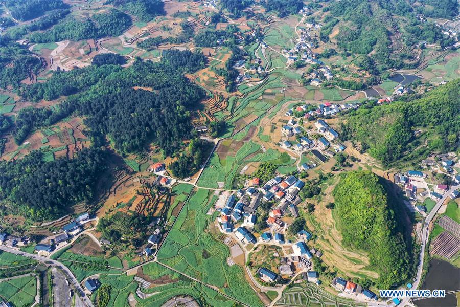 Aerial photo taken on April 14, 2020 shows a view of Huamao Village of Zunyi, southwest China's Guizhou Province. Huamao Village was a poverty-stricken village. Over the past years, local authorities have been promoting agro-tourism and marketization of local agricultural specialties through targeted poverty alleviation measures. By 2019, over 40 homestays have been established with over 400 villagers working in tourism industry. So far, all villagers in Huamao have shaken off poverty. (Xinhua/Liu Xu)