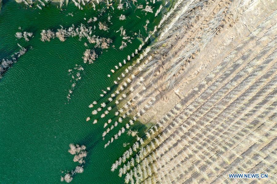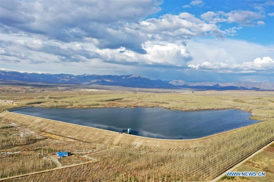 Aerial photo taken on April 19, 2020 shows a reservoir for reclaimed water in Altay, northwest China's Xinjiang Uygur Autonomous Region. Reclaimed water is widely used in a nursery built on the gobi desert to improve local ecological environment in Altay. Since 2017, the nursery has approximately provided 400,000 seedlings with afforestation of 5,000 mu (about 333 hectare) on barren mountains. (Xinhua/Ding Lei)