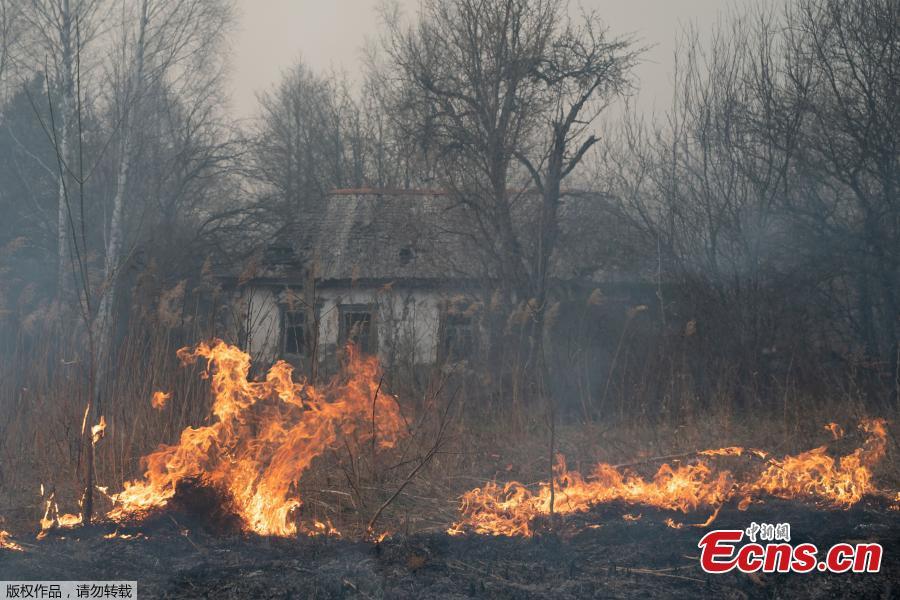 An aerial view shows grass and plants on fire, as an operation to extinguish wildfires around the defunct Chernobyl nuclear plant continues, in Lyudvynivka in Kiev Region, Ukraine April 18, 2020. (Photo/Agencies)
