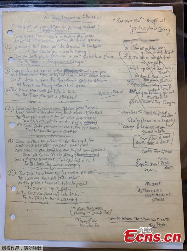 The lyrics of Bob Dylan's song "The Times They Are-A-Changin' " are seen in an undated photo before going up for sale in Los Angeles, California, with an asking price of $2.2 million. (Photo/Agencies)