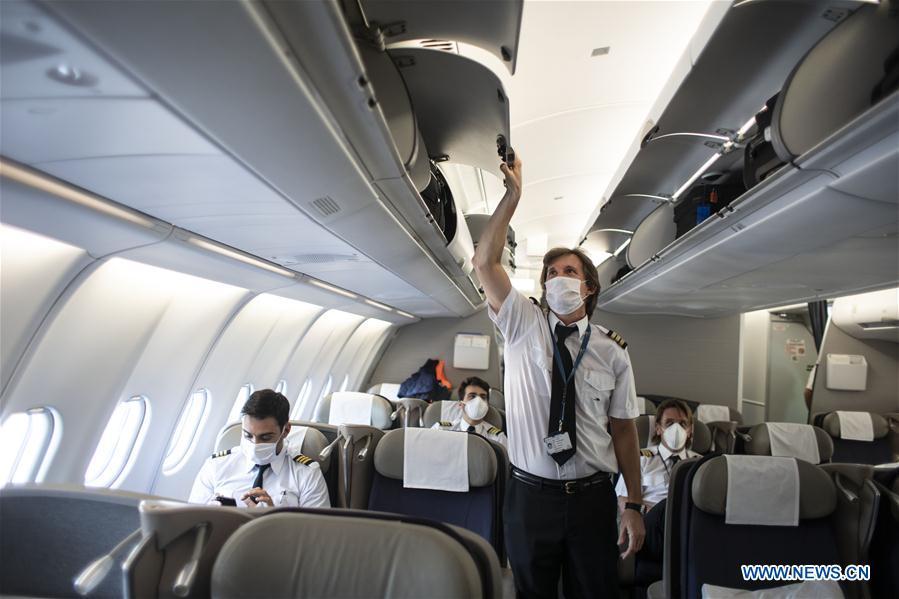 Pilots of a charter plane gesture ahead of its departure for China's Shanghai from Ezeiza International Airport in Buenos Aires, Argentina, April 17, 2020. After flying over 38,000 km in some 56 hours, the first-ever direct flight from China to Argentina landed in Buenos Aires on Saturday, carrying urgently-needed medical supplies for tackling COVID-19. (Photo by Martin Zabala/Xinhua)