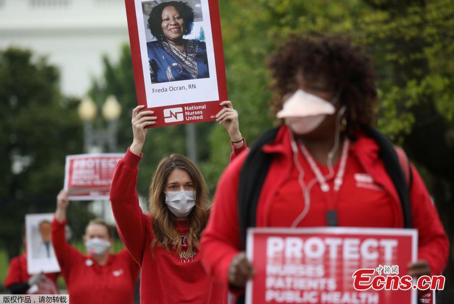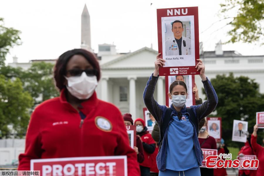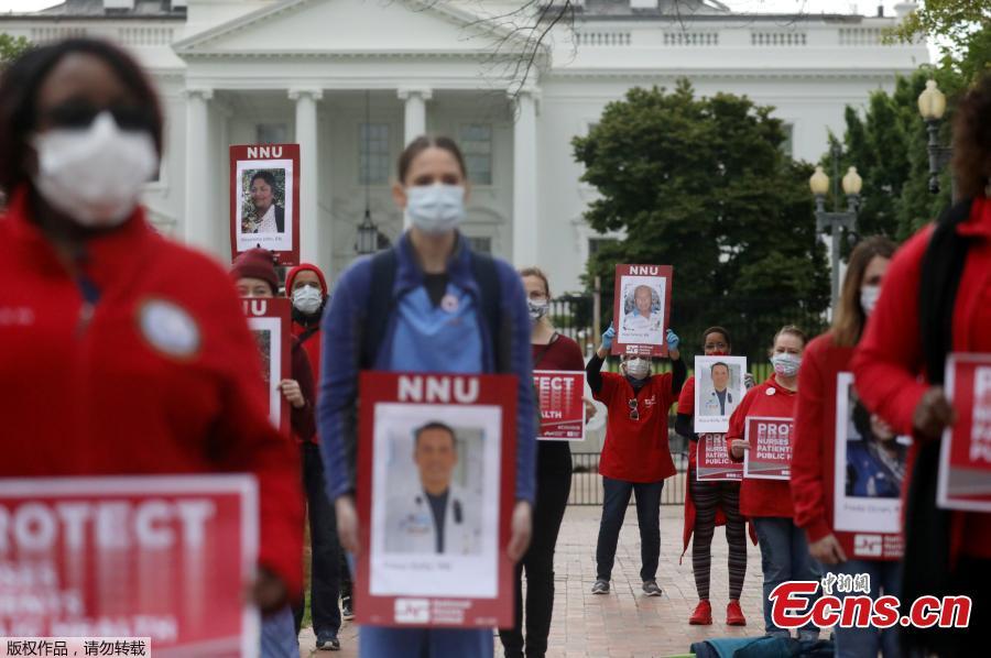 Registered nurses, members of National Nurses United (NNU), the largest union of RNs in the country, protest in front of the White House in Washington, D.C., April 21, 2020 to call attention to the tens of thousands of health care workers nationwide who have become infected with COVID-19 due to lack of personal protective equipment (PPE). (Photo/Agencies)