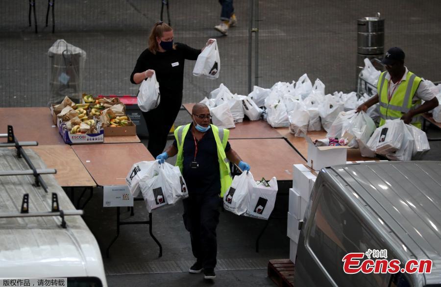 Volunteers carry emergency food parcels for local residents in need at Alexandra Palace, amid the coronavirus disease (COVID-19) outbreak, in London, Britain April 21, 2020. (Photo/Agencies)