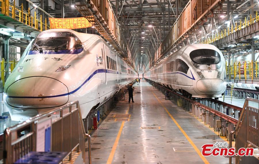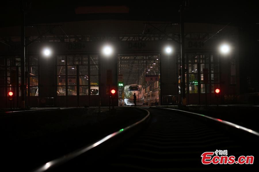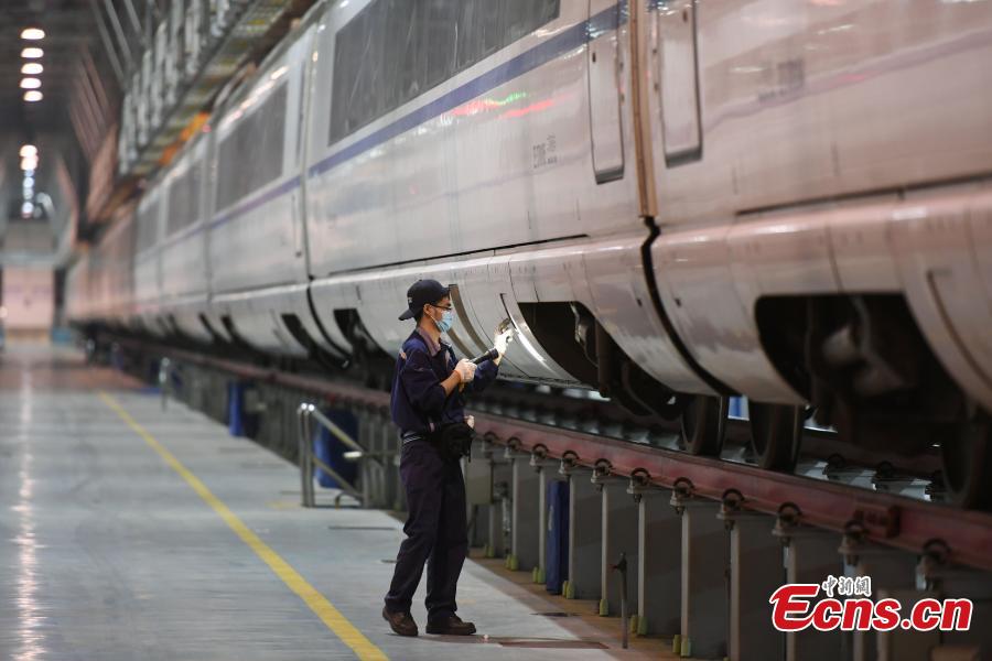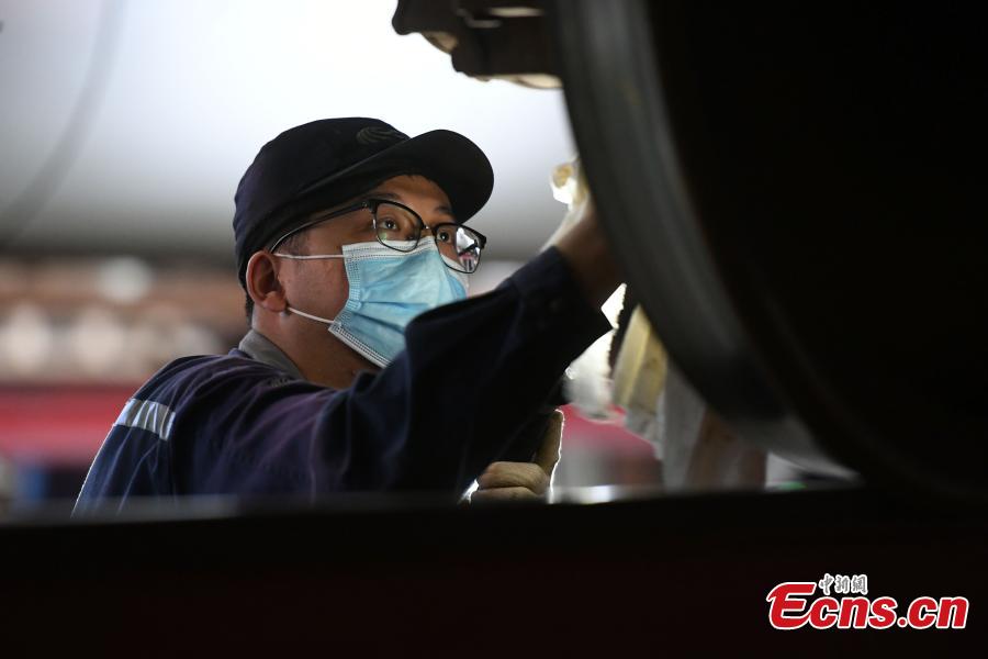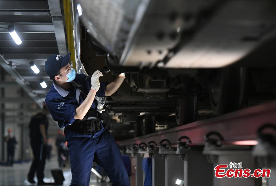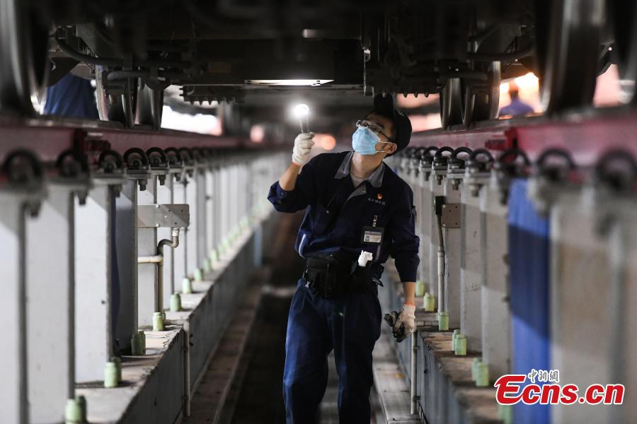 A staff member inspects a train at a bullet train maintenance hub in Hefei, capital of east China's Anhui Province, April 29, 2020. Every night, train staff members here fully maintain the bullet trains to remove hidden dangers and ensure train running security. (Photo: China News Service/Han Suyuan)