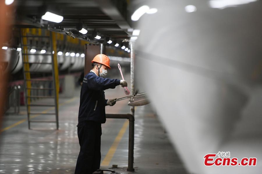 A staff member maintains a bullet train at a bullet train maintenance hub in Hefei, capital of east China's Anhui Province, April 29, 2020. Every night, train staff members here fully maintain the bullet trains to remove hidden dangers and ensure train running security. (Photo: China News Service/Han Suyuan)