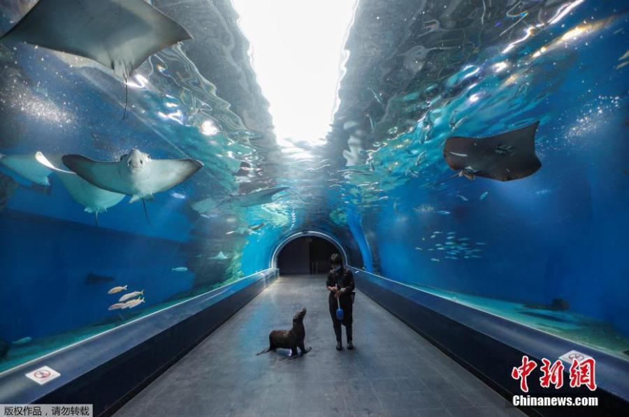 A female seal and the quarium keeper stroll together as a part of their practice for their show at an empty visitors' area at the Aqua Park Shinagawa which is closed to the public amid the coronavirus disease (COVID-19) outbreak in Tokyo, Japan, April 30, 2020. (Photo/Agencies)