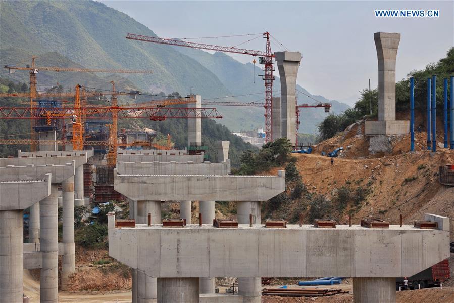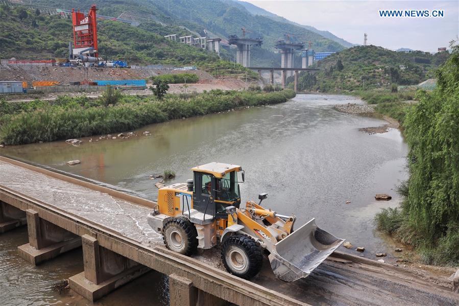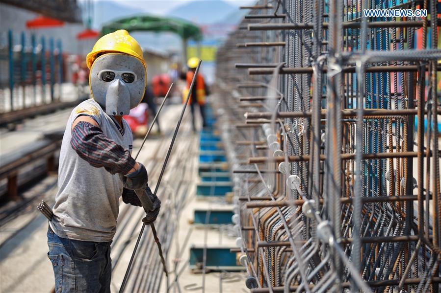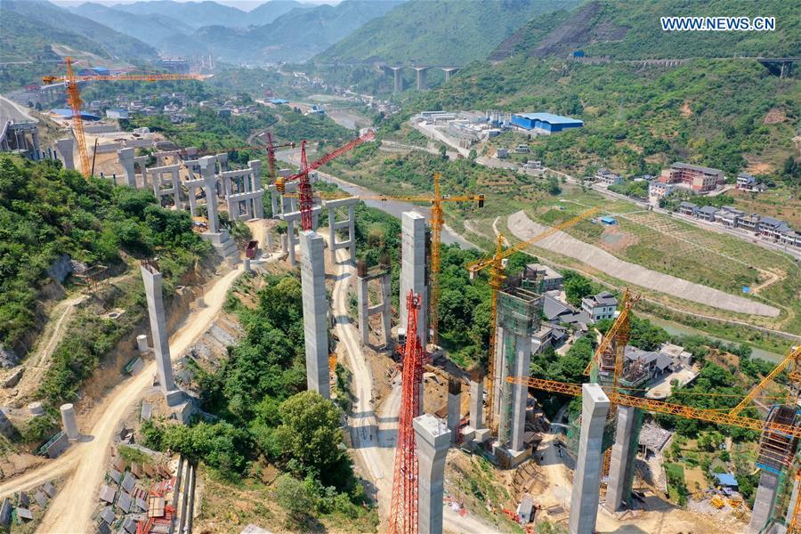 Photo taken on May 2, 2020 shows the construction site of a grand bridge of Chongqing-Zunyi expressway in southwest China's Guizhou Province. During the International Labor Day holiday, workers are accelerating the expressway construction under strict epidemic prevention measures. (Xinhua/Liu Xu)