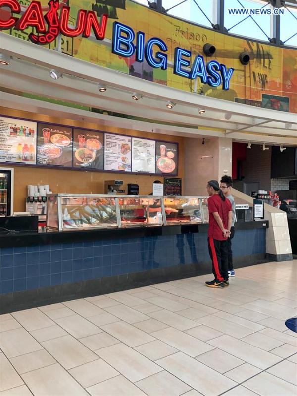 Two customers order foods at a shopping mall in Frisco, on the outskirts of Dallas, Texas, the United States, May 5, 2020. After closed for several weeks due to the outbreak of COVID-19 pandemic, the shopping mall reopened with shortened business hours on Tuesday. (Photo by Dan Tian/Xinhua)