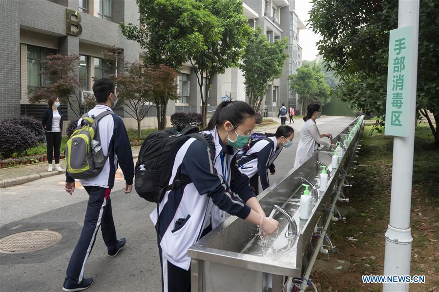 Senior students wash hands after entering school at Hubei Wuchang Experimental High School in Wuhan, central China's Hubei Province, May 6, 2020. Senior students in 121 high and vocational schools returned to campus on Wednesday in Wuhan City. These schools have carried out cleaning and preventive disinfection before opening. Health tests are required for all faculty and staff of Grade Three classes in these schools and for students prior to their return. (Xinhua/Xiong Qi)