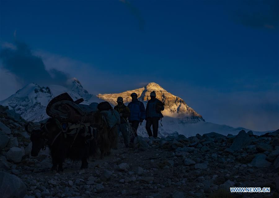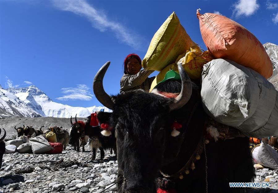 A yak transport team prepares to head to the advance camp at an altitude of 6,500 meters on Mount Qomolangma, April 28, 2020. (Xinhua/Jigme Dorje)