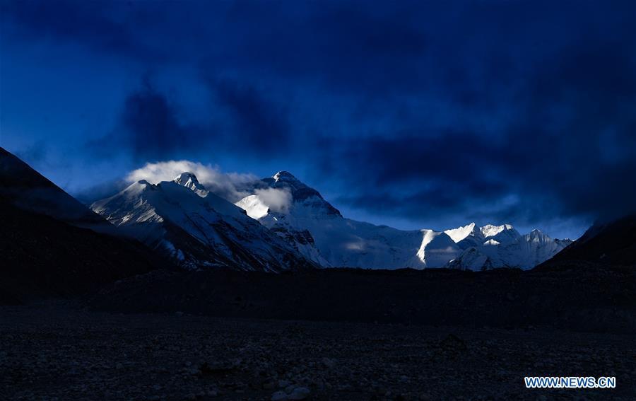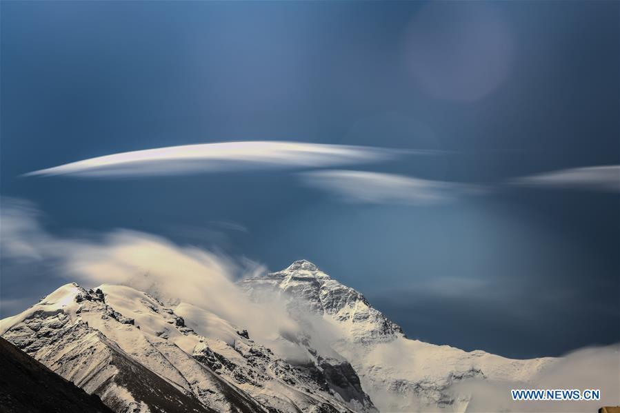 Photo taken on May 4, 2020 shows the Mount Qomolangma shrouded by clouds. (Xinhua/Jigme Dorje)