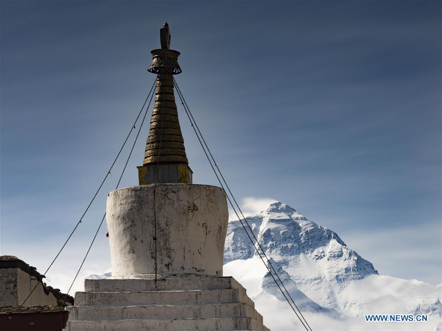 Mount Qomolangma is pictured from the Rongbuk Monastery at the foot of Mount Qomolangma on May 1, 2020. (Xinhua/Purbu Zhaxi)