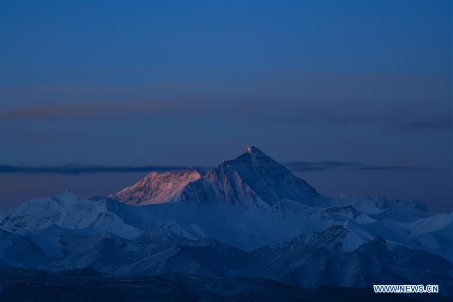 Photo taken on April 25, 2020 shows the Mount Qomolangma at sunrise. (Xinhua/Sun Fei)