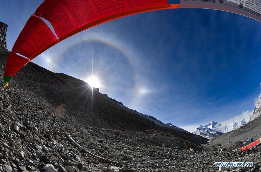 Photo taken on May 1, 2020 shows a solar halo over Mount Qomolangma. (Xinhua/Jigme Dorje)
