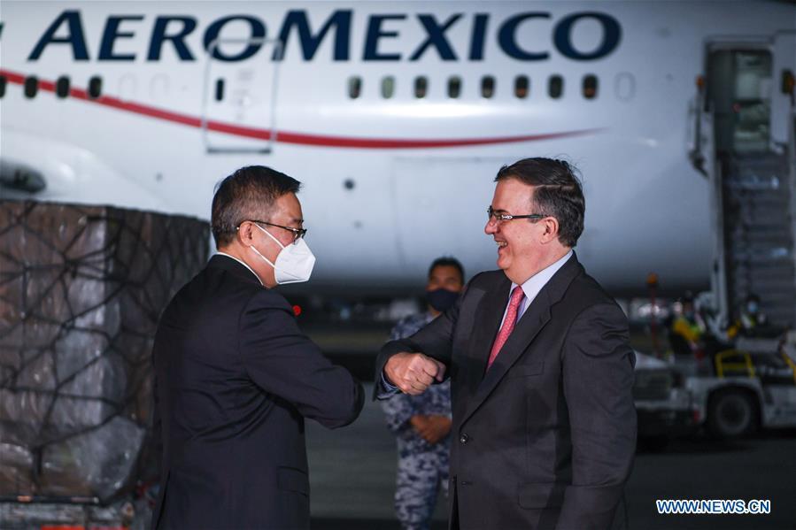 China's Ambassador to Mexico Zhu Qingqiao (L) greets Mexican Foreign Minister Marcelo Ebrard with elbow bumps during a welcome ceremony for a flight from China with medical supplies at an international airport in Mexico City, Mexico, on May 12, 2020. A flight from Shanghai to Mexico City arrived late Tuesday, marking the completion of the first phase of a China-Mexico initiative to combat the novel coronavirus (COVID-19) pandemic, top officials said on Wednesday. Since launching the massive air bridge between the two countries in April, ten flights have brought about 120 tons of medical equipment acquired by Mexico's government from a Chinese firm. (Xinhua/Xin Yuewei)