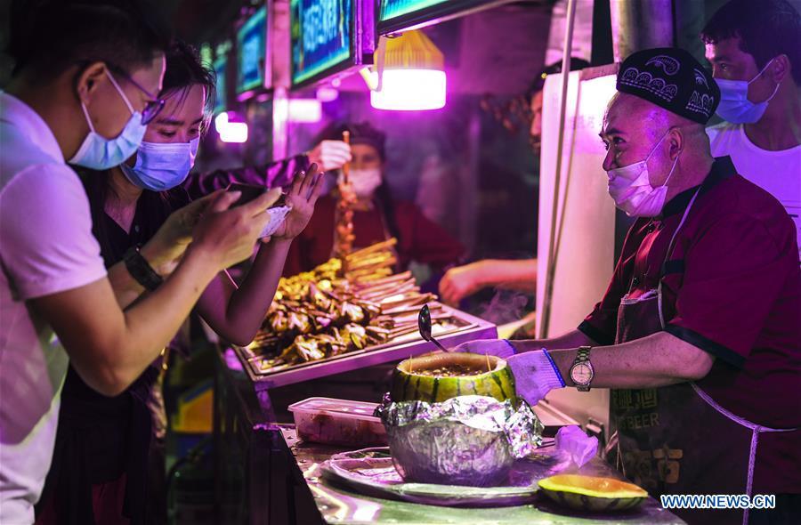 A vendor serves local delicacies to customers at a night fair in Hotan, northwest China's Xinjiang Uygur Autonomous Region, May 18, 2020. As the weather turned warm, local tourism activities have gradually recovered. (Xinhua/Wang Fei)