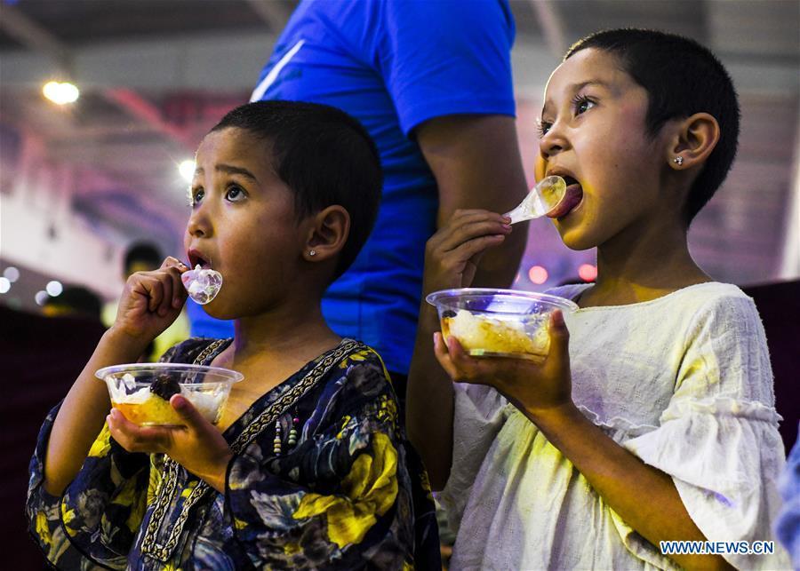 Children taste delicacies at a night fair in Hotan, northwest China's Xinjiang Uygur Autonomous Region, May 16, 2020. As the weather turned warm, local tourism activities have gradually recovered. (Xinhua/Wang Fei)