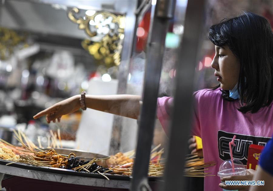 A tourist purchases delicacies at a night fair in Hotan, northwest China's Xinjiang Uygur Autonomous Region, May 18, 2020. As the weather turned warm, local tourism activities have gradually recovered. (Xinhua/Wang Fei)