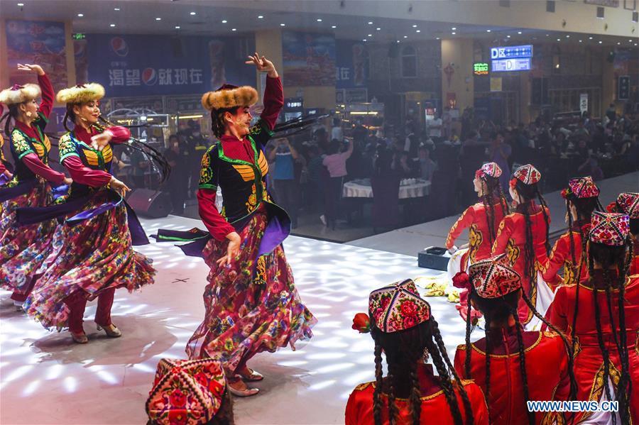Dancers perform at a night fair in Hotan, northwest China's Xinjiang Uygur Autonomous Region, May 16, 2020. As the weather turned warm, local tourism activities have gradually recovered. (Xinhua/Wang Fei)