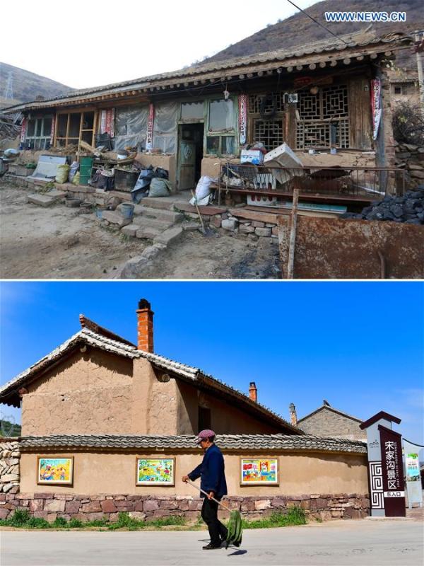 The combo photo shows the street view in Songjiagou village in Kelan County, north China's Shanxi Province, before (file photo, up) and after (photo taken by Cao Yang on May 9, 2020) renovation. Kelan County is located in central area of Loess Plateau and the deep Lyuliang Mountains with nearly half of its villages facing poor production and living conditions. In 2017 the local government implemented a plan of relocation for poor households in remote villages as a key step to alleviate poverty and Songjiagou New Village became a centralized relocation site which absorbing 145 poor households from the surrounding 14 villages. In recent years, Songjiagou New Village has begun to improve environment and local landscape to develop rural tourism and open agricultural cooperatives and agricultural products processing plants to increase villagers' income. Residents in the once poverty-stricken areas in the mountains are seeking a better life. (Xinhua)