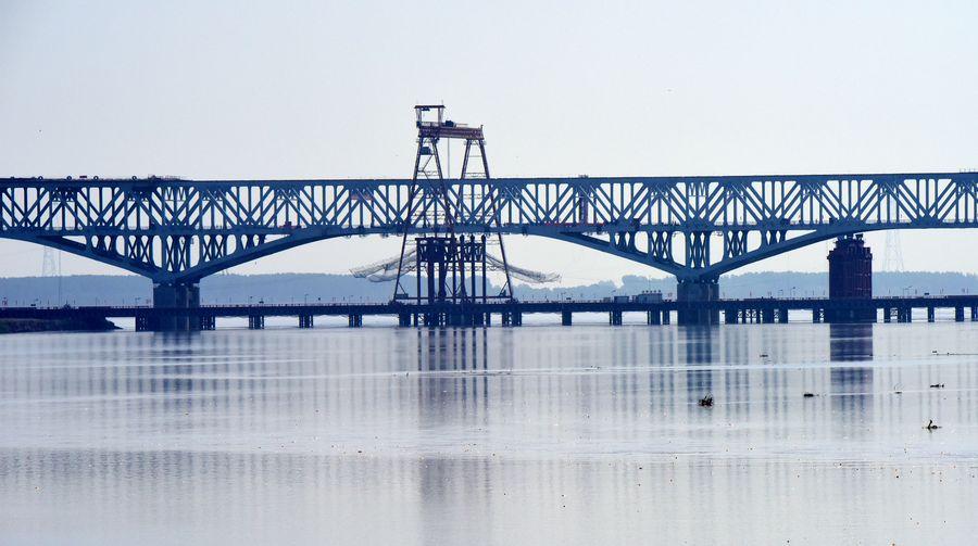 The upper floor of the bridge is a six-lane expressway while the lower floor is a four-track railway.