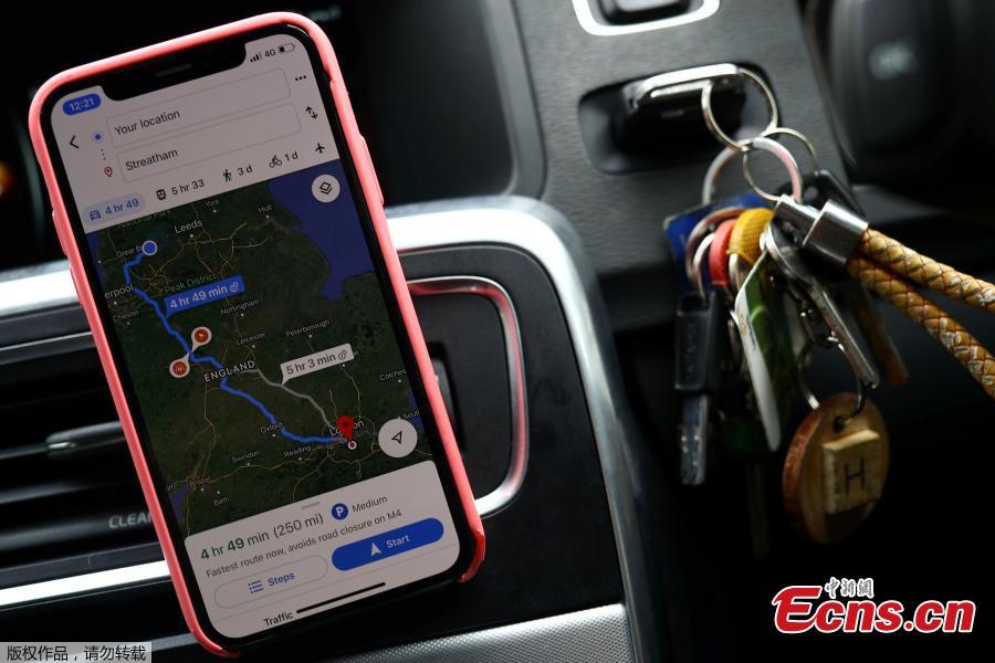 A map on Reuters photographer Hannah McKay's phone, shows directions to her home in London as she drives back from the Lancashire Women and Newborn Centre, during the coronavirus disease (COVID-19) outbreak, in Burnley, East Lancashire, Britain, May 15, 2020. (Photo/Agencies)