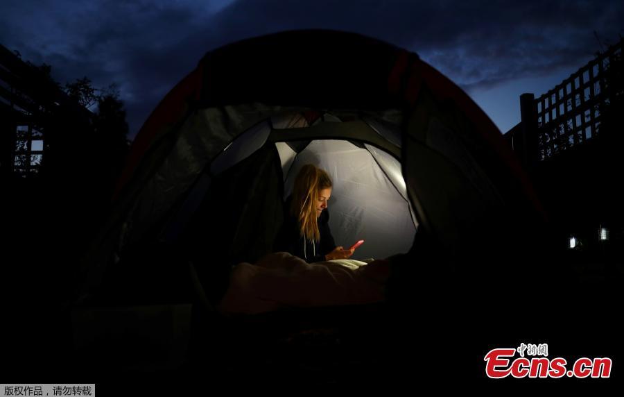 Photographer Hannah McKay sends a message from her mobile while staying in a tent overnight, in the back garden of her parent's home, during the coronavirus (COVID-19) outbreak, in Coventry, Britain, May 13, 2020. Hannah McKay had the opportunity to travel north to cover medical workers in the cities of Blackburn and Burnley and divided the six-hour journey into two parts, sleeping in a tent in her parents' garden in Coventry before setting off the next morning.(Photo/Agencies)