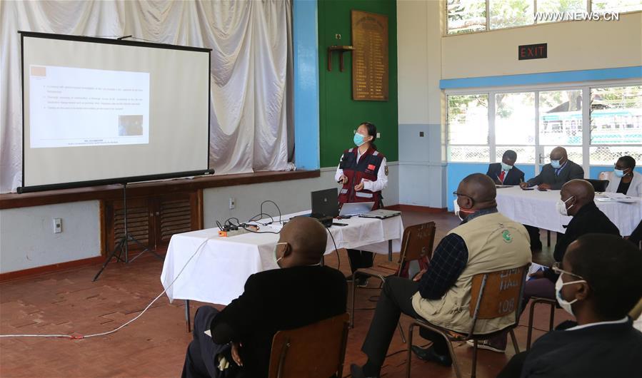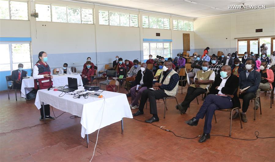 Chinese medical team member Peng Yue gives a lecture to local medical workers in Mvurwi, Zimbabwe, May 19, 2020. A team of Chinese medical experts on Tuesday visited Mvurwi Hospital to exchange notes with their Zimbabwean counterparts on how best to fight the COVID-19 pandemic. (Xinhua/Zhang Yuliang)