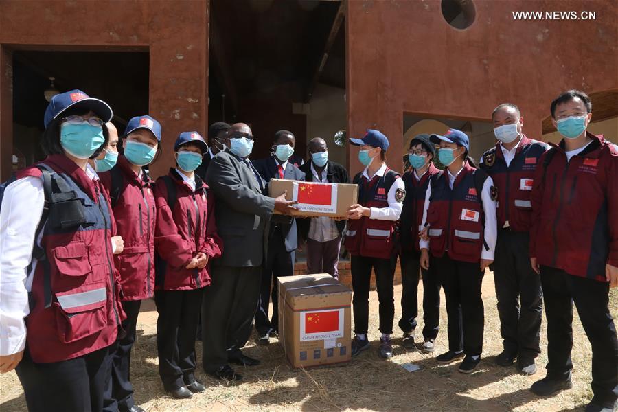 Members of a Chinese medical team pose for a group photo after donating medical supplies to Mvurwi Hospital in Mvurwi, Zimbabwe, May 19, 2020. A team of Chinese medical experts on Tuesday visited Mvurwi Hospital to exchange notes with their Zimbabwean counterparts on how best to fight the COVID-19 pandemic. (Xinhua/Zhang Yuliang)