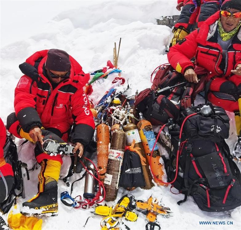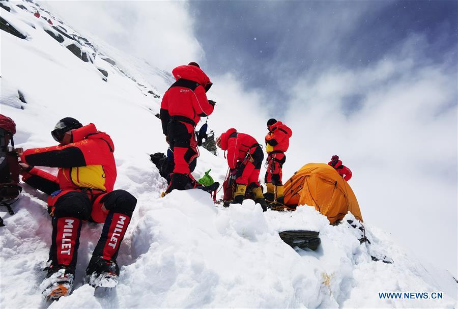 Chinese surveyors prepare to retreat to the advance camp at an altitude of 6,500 meters on Mount Qomolangma, on May 21, 2020. The Chinese mountaineering team has further delayed its plan to reach the peak of Mt. Qomolangma on May 22 to accurately measure its height due to bad weather conditions. Located at the China-Nepal border, Mount Qomolangma is the world's highest peak, with its north part located in Xigaze of southwest China's Tibet Autonomous Region. (Xinhua/Penpa)