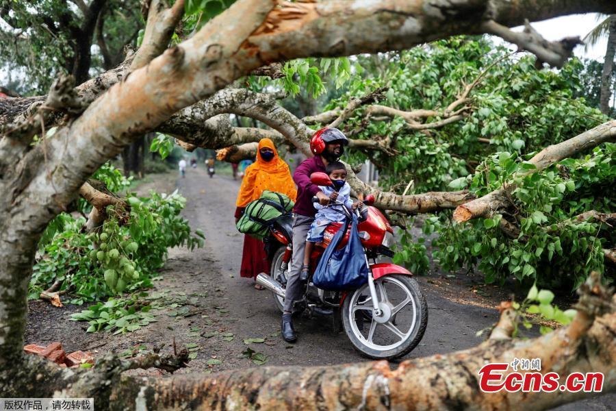 A man with a child ride on motorbike in the street blocked by trees that were uprooted by the cyclone Amphan, in Satkhira, Bangladesh May 21, 2020. (Photo/Agencies)