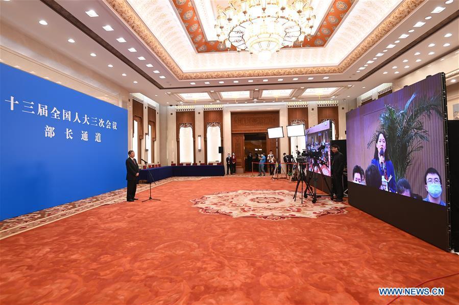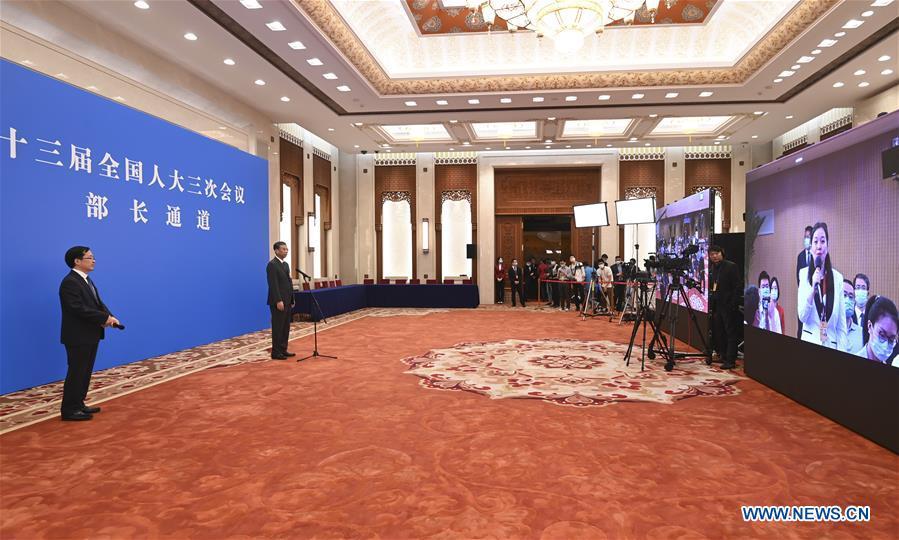 He Lifeng, head of the National Development and Reform Commission, is interviewed via video link after the opening meeting of the third session of the 13th National People's Congress (NPC) in Beijing, capital of China, May 22, 2020. (Xinhua/Chen Yehua)