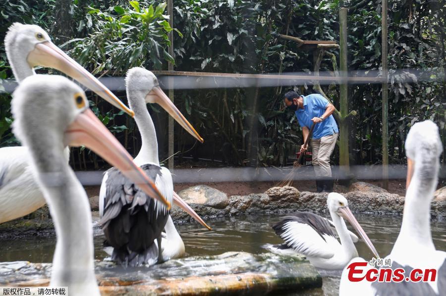 A worker wears a protective mask as he sweeps a pelicans' enclosure at a zoo, amid the coronavirus disease (COVID-19) outbreak in Bandung, West Java Province, Indonesia, May 18, 2020. (Photo/Agencies)