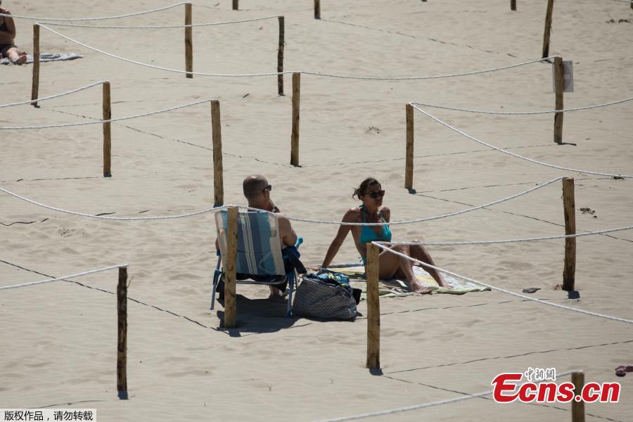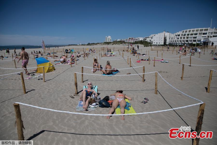 Sunbathers lie in an area marked to enforce social distancing measures in La Grande Motte, southern France, Sunday, May 24, 2020. French families flocked to the beach at La Grande Motte on the Mediterranean shore Sunday, swimming and sunbathing in areas carefully marked to keep them a safe distance from others. (Photo/Agencies)