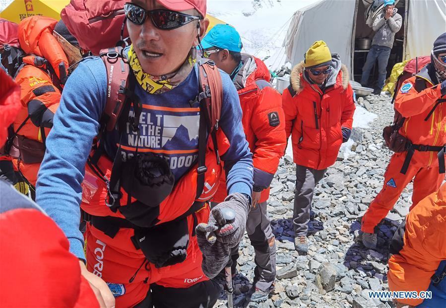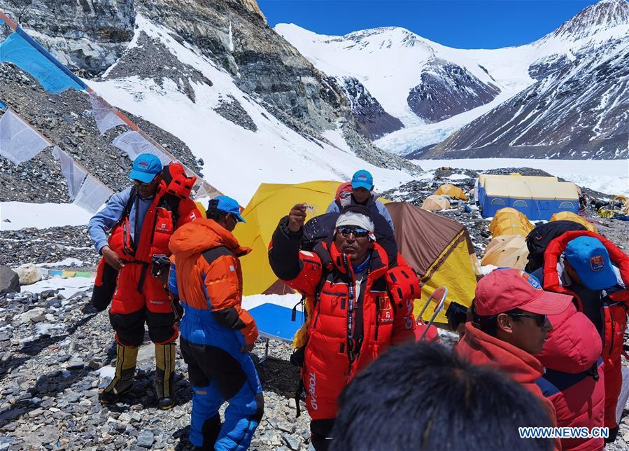Chinese surveyors prepare to set out from the advance camp at an altitude of 6,500 meters on Mount Qomolangma, on May 24, 2020. A Chinese mountaineering team on Sunday departed again for the summit of Mount Qomolangma after their plans to reach the world's highest mountain peak were delayed twice by the bad weather. (Xinhua/Lhapa)