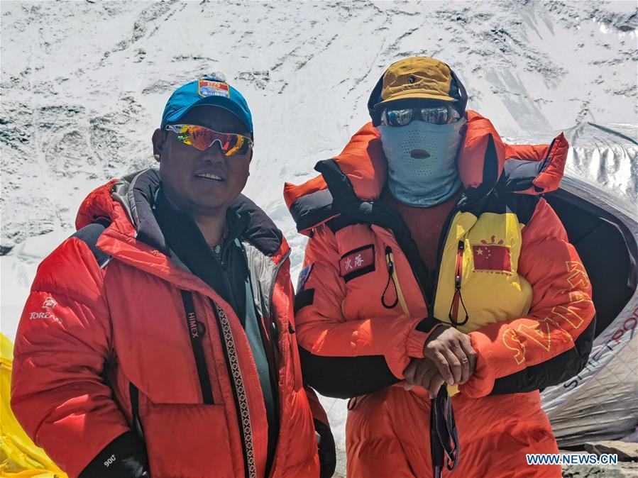 Deputy leader of Mount Qomolangma remeasuring team Samdrup (L) and peak-climbing squad leader Tselok are seen at the advance camp at an altitude of 6,500 meters on Mount Qomolangma, on May 24, 2020. A Chinese mountaineering team on Sunday departed again for the summit of Mount Qomolangma after their plans to reach the world's highest mountain peak were delayed twice by the bad weather. (Xinhua/Tashi Tsering)