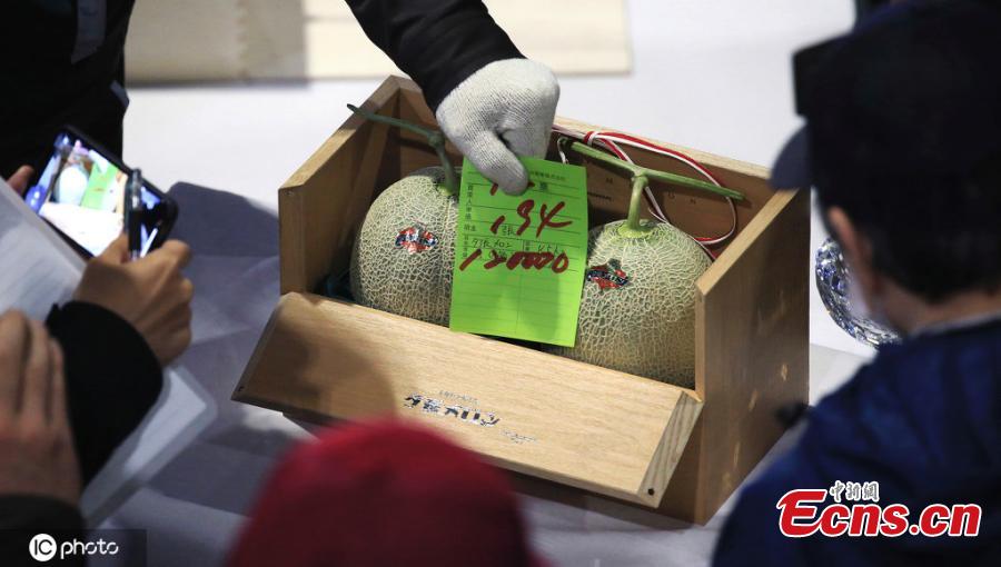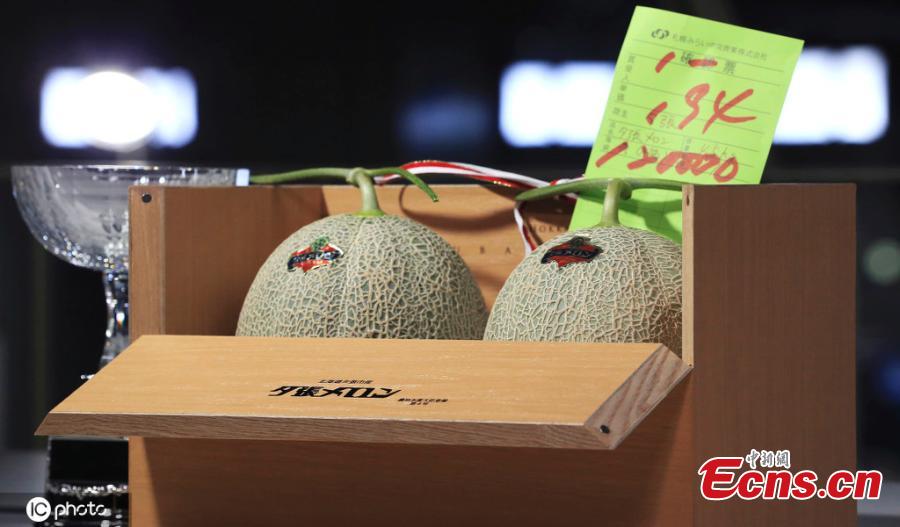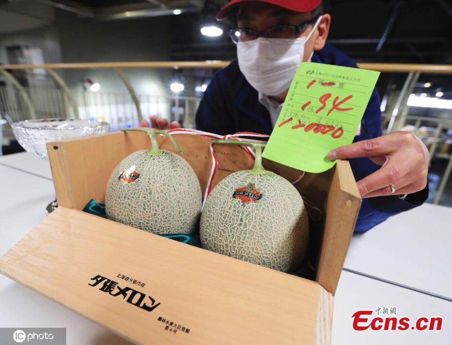Two Yubari Melons that are priced 120,000 yen (about$1120), are displayed at Sapporo Central Wholesale Market in Sapporo City, Hokkaido Prefecture in Japan on May 25, 2020. The first auction of "Yubari Melon" was held on the same day, and the price was the lowest ever recorded due to the spread of the coronavirus pandemic. Last year, two yubari melons were knocked down with 5,000,000 yen (over$45,000). Yubari melon, which has orange-colored flesh and strong sweetness, is popular nationwide as a luxury melon brand, and is cultivated by 103 farmers in Yubari city, Hokkaido Prefecture. (Photo/IC)