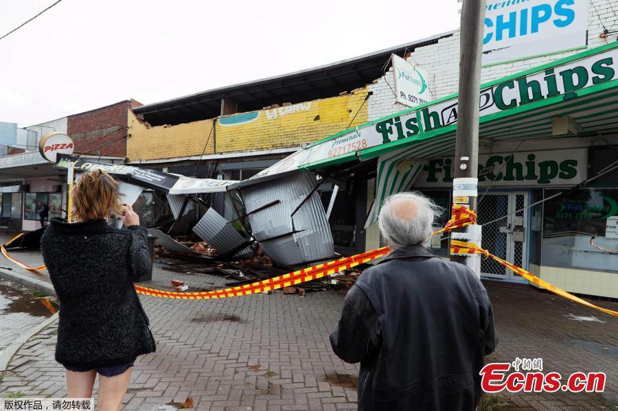 People photograph shops roped off after they sustained damage in the Perth suburb of Bedford on May 25, 2020, after the area was lashed by gale force winds and a tidal surge from the remnants of Tropical Cyclone Mangga. (Photo/Agencies)