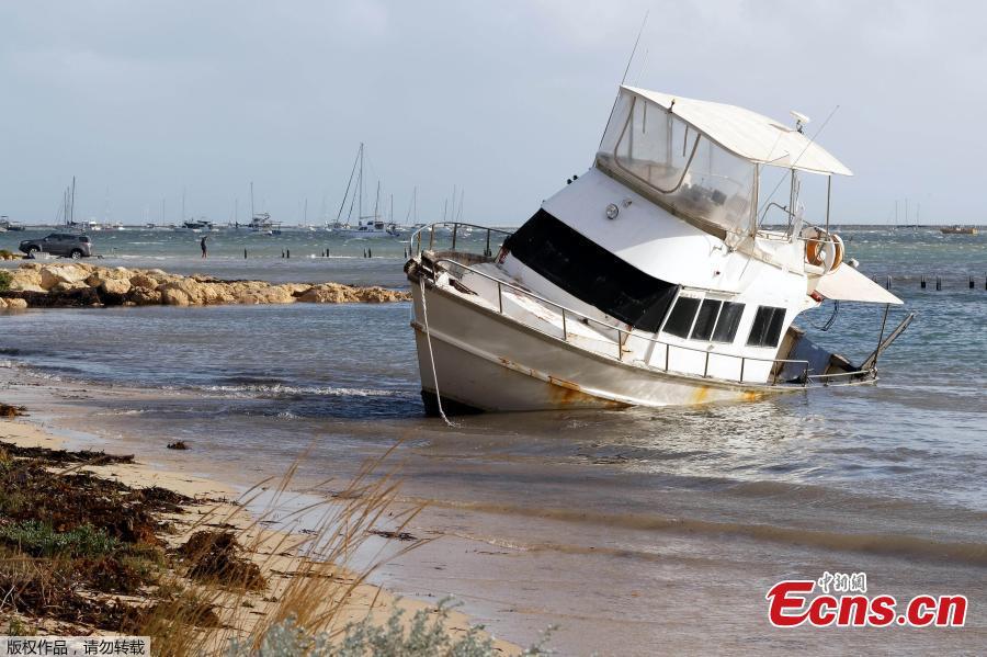 A boat lists to one side at the beach in the Perth suburb of Rockingham on May 25, 2020, after the area was lashed by gale force winds and a tidal surge from the remnants of Tropical Cyclone Mangga.(Photo/Agencies)