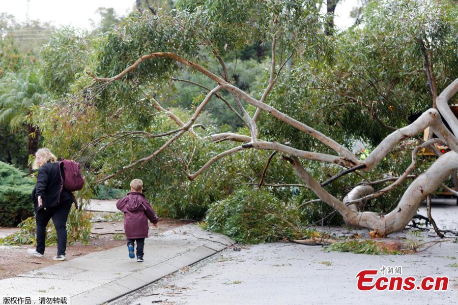 A woman and her son walk past a fallen tree in the Perth suburbs on May 25, 2020, after the area was lashed by gale force winds and a tidal surge from the remnants of Tropical Cyclone Mangga.(Photo/Agencies)