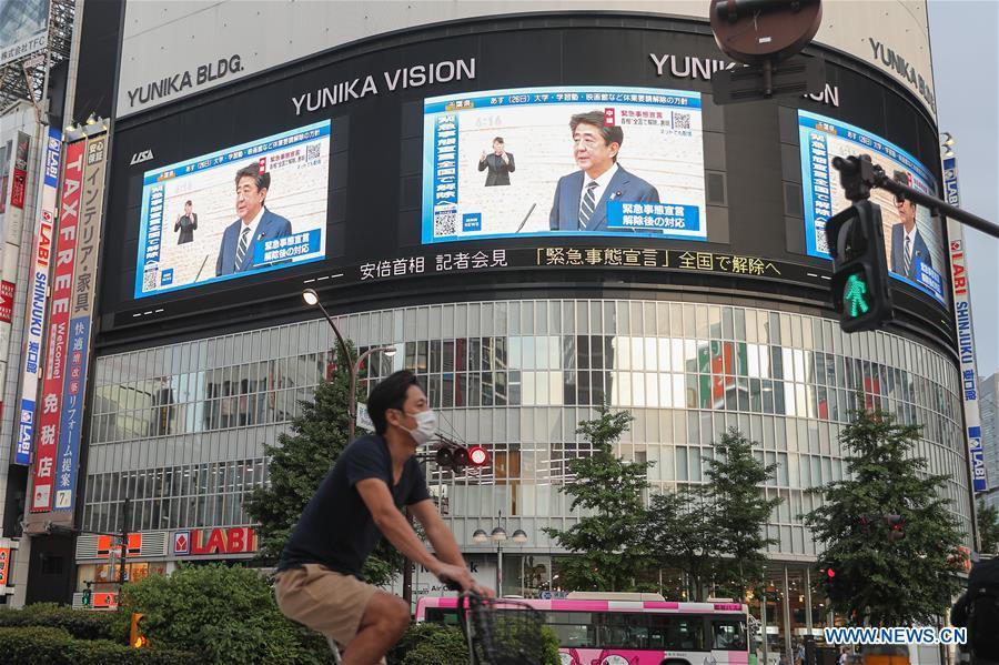 Electronic screens show that Japanese Prime Minister Shinzo Abe speaks at a press conference in Tokyo, Japan, on May 25, 2020. Japanese Prime Minister Shinzo Abe on Monday lifted the COVID-19 state of emergency in the five remaining prefectures still under restrictions, including Tokyo, as the spread of the virus has largely been brought under control. (Xinhua/Du Xiaoyi)