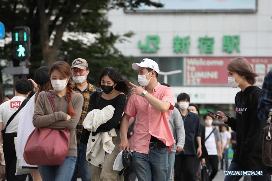 People wearing face masks walk in a street in Shinjuku, Tokyo, Japan, on May 25, 2020. Japanese Prime Minister Shinzo Abe on Monday lifted the COVID-19 state of emergency in the five remaining prefectures still under restrictions, including Tokyo, as the spread of the virus has largely been brought under control. (Xinhua/Du Xiaoyi)