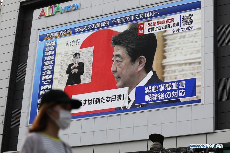 An electronic screen shows that Japanese Prime Minister Shinzo Abe speaks at a press conference in Tokyo, Japan, on May 25, 2020. Japanese Prime Minister Shinzo Abe on Monday lifted the COVID-19 state of emergency in the five remaining prefectures still under restrictions, including Tokyo, as the spread of the virus has largely been brought under control. (Xinhua/Du Xiaoyi)