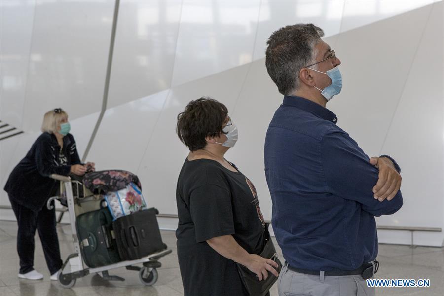 Passengers wearing face masks watch a performance at the Athens International Airport "Eleftherios Venizelos" in Athens, Greece, on May 25, 2020. Greece took more steps to normality on Monday, reopening restaurants and cafes while allowing travel to all the islands. Members of the Youth Symphony Orchestra of Greece performed at the Athens International Airport "Eleftherios Venizelos" to celebrate the day and greet travelers as the airport is getting prepared for the delayed tourism season this summer. (Xinhua/Marios Lolos)