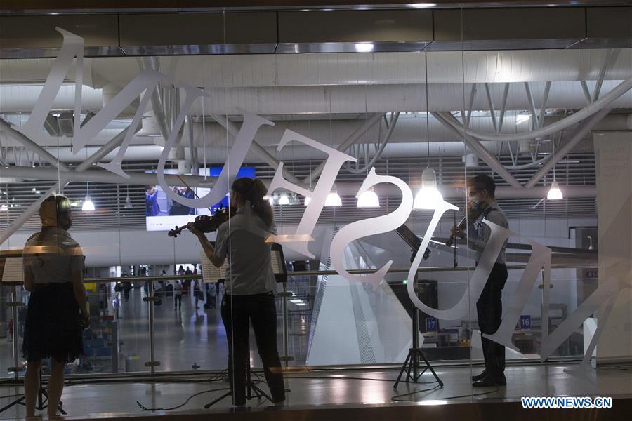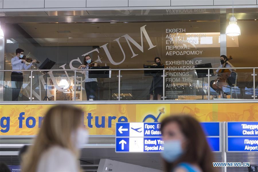 Artists perform at the Athens International Airport "Eleftherios Venizelos" in Athens, Greece, on May 25, 2020. Greece took more steps to normality on Monday, reopening restaurants and cafes while allowing travel to all the islands. Members of the Youth Symphony Orchestra of Greece performed at the Athens International Airport "Eleftherios Venizelos" to celebrate the day and greet travelers as the airport is getting prepared for the delayed tourism season this summer. (Xinhua/Marios Lolos)