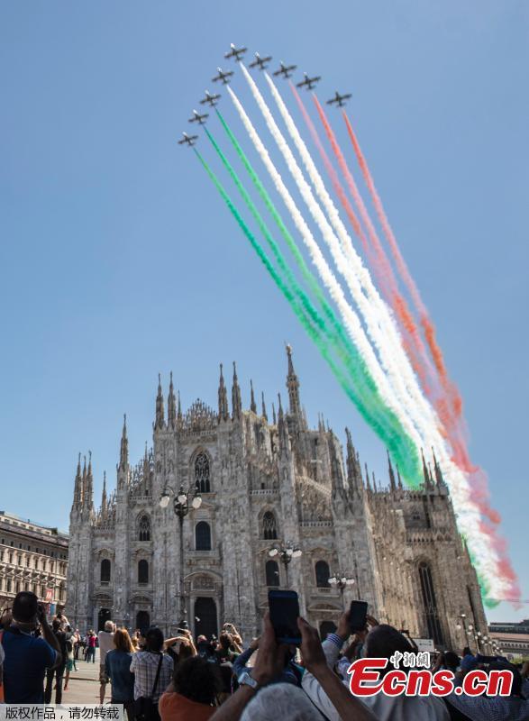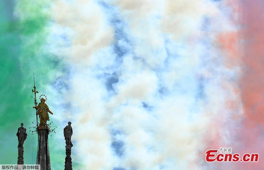 The Frecce Tricolori aerobatic squad of the Italian Air Force flies over Milan’s Duomo cathedral, northern Italy, Monday, May 25, 2020 on the occasion of the 74th anniversary of the founding of the Italian Republic on June 2, 1946. This year the acrobatic squad will fly over several Italian cities to bring a message of unity and solidarity during the coronavirus pandemic.(Photo/Agencies)