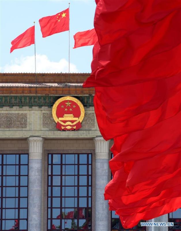 Photo taken on May 27, 2020 shows flags on the Tian'anmen Square and atop the Great Hall of the People in Beijing, capital of China. The third session of the 13th National Committee of the Chinese People's Political Consultative Conference (CPPCC) will hold its closing meeting at the Great Hall of the People in Beijing on Wednesday afternoon. (Xinhua/Li He)