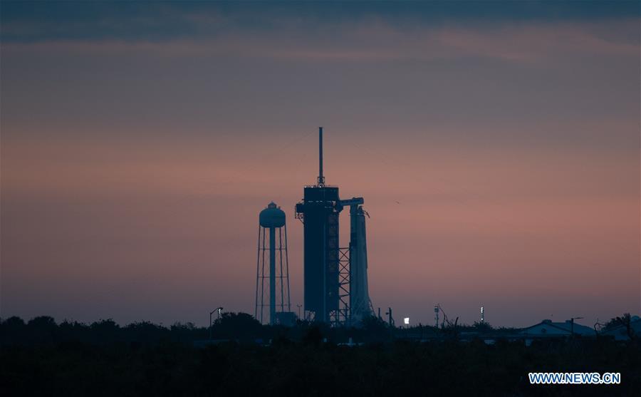 A SpaceX Falcon 9 rocket with Crew Dragon spacecraft onboard is seen on the launch pad at sunrise, at NASA's Kennedy Space Center in Florida, the United States, May 27, 2020. NASA and SpaceX postponed historic launch of two astronauts to space from NASA's Kennedy Space Center in Florida on Wednesday due to bad weather. (Joel Kowsky/NASA/Handout via Xinhua)