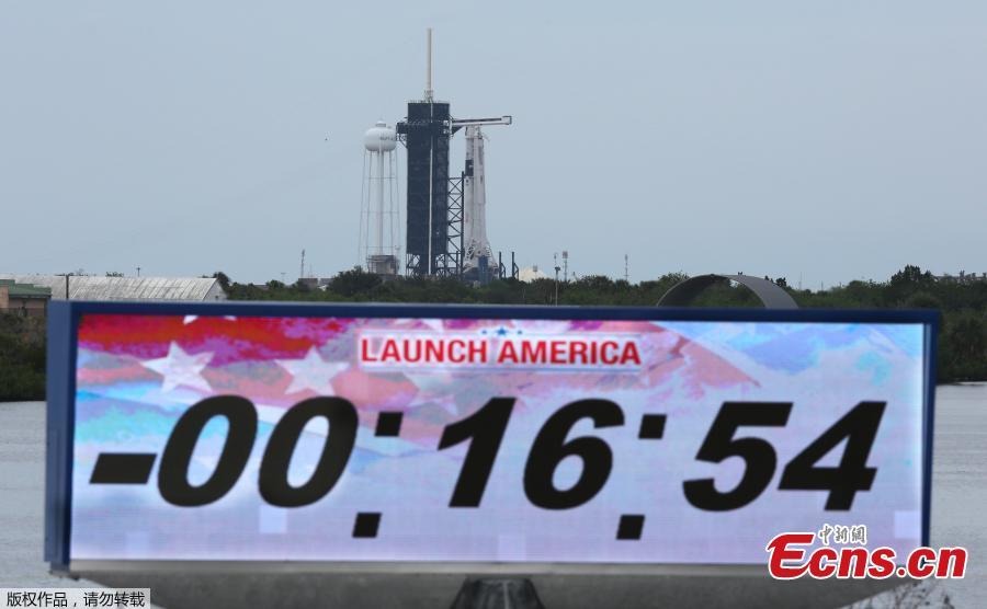 A screen showing the countdown clock is seen with SpaceX Falcon 9 rocket and Crew Dragon spacecraft in the background as launch from NASA's Kennedy Space Center was scrubbed, in Cape Canaveral, Florida, U.S. May 27, 2020. (Photo/Agencies)